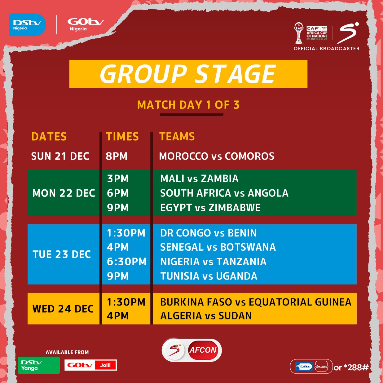 Now to the most important part of the meeting: logistics. Every AFCON 2025 match will be shown live on the SuperSport AFCON dedicated channel, available on DStv Channel 202 and GOtv Channel 59. If you’re not there, you’re not in the meeting.
